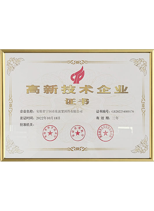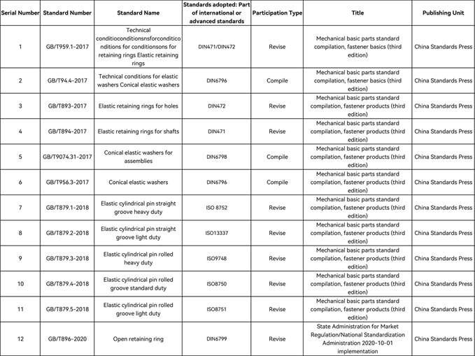 Die Dongbo Company war Mitglied des Nationalen Technischen Komitees für die Standardisierung von Verbindungselemente für viele Jahre und veranstalteten die 4. Jahrestagung des 5. National Technical Komitee für die Standardisierung von Befestigungen im Jahr 2015. Es wurde nacheinander geführt oder nahm an der Formulierung und Überarbeitung von 13 nationalen Standards teil, einschließlich technischer Bedingungen für elastische Stützringe, elastische zylindrische Stifte und Scheibenscheiben.